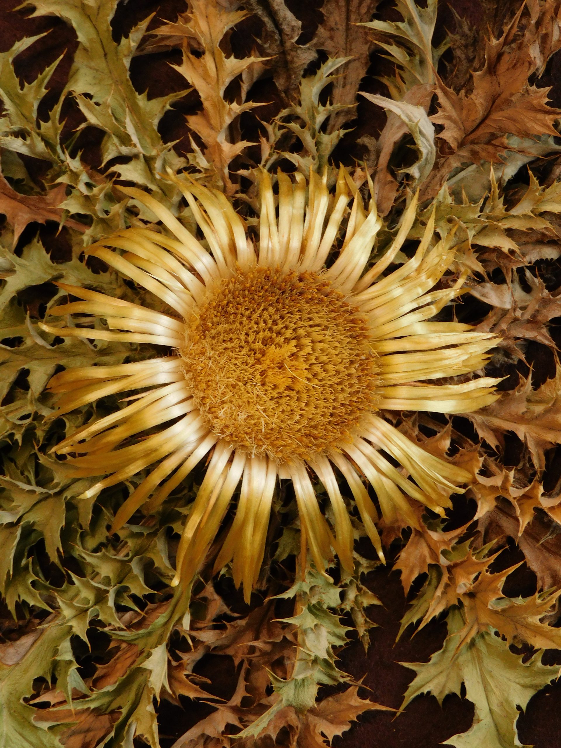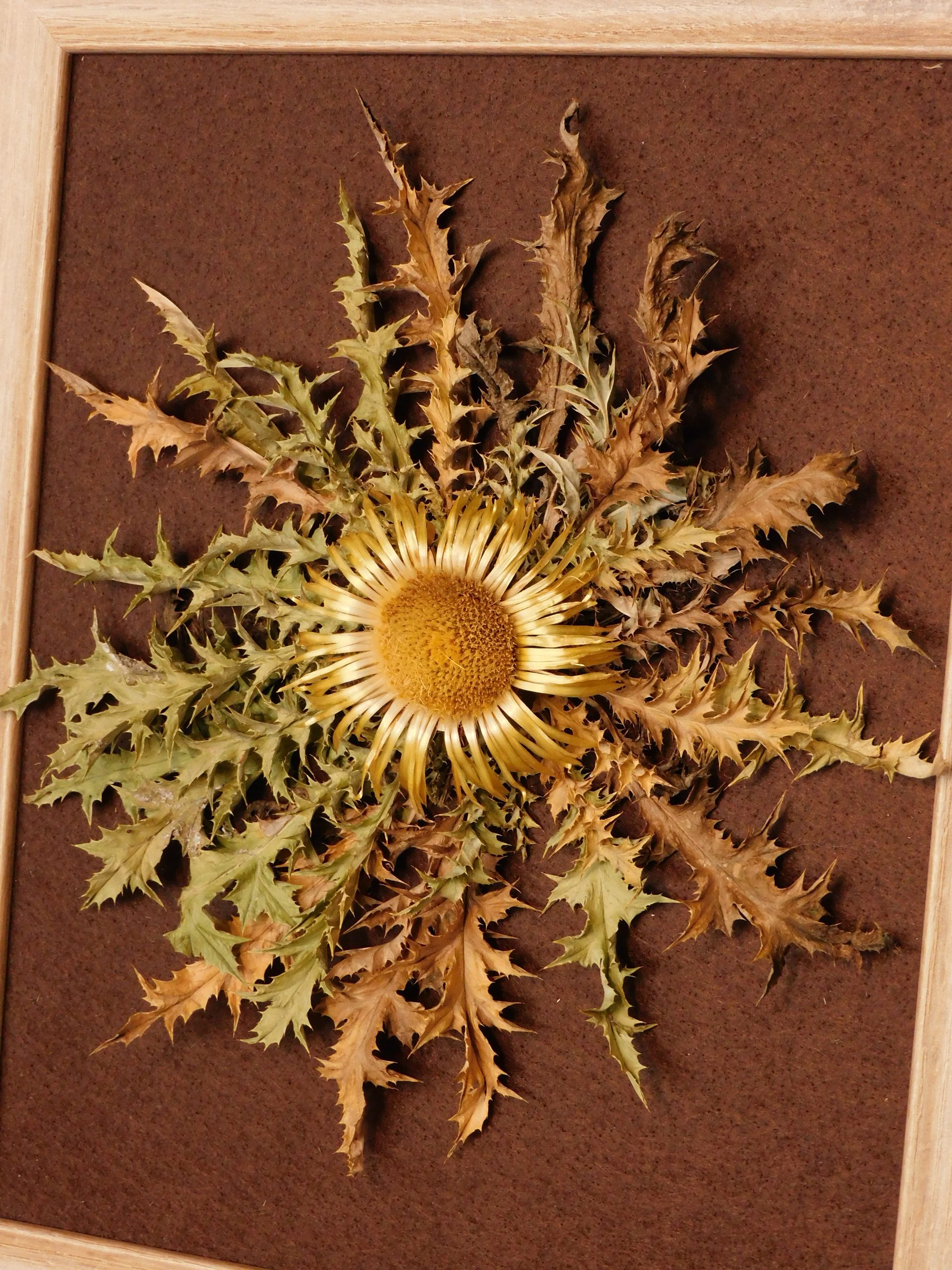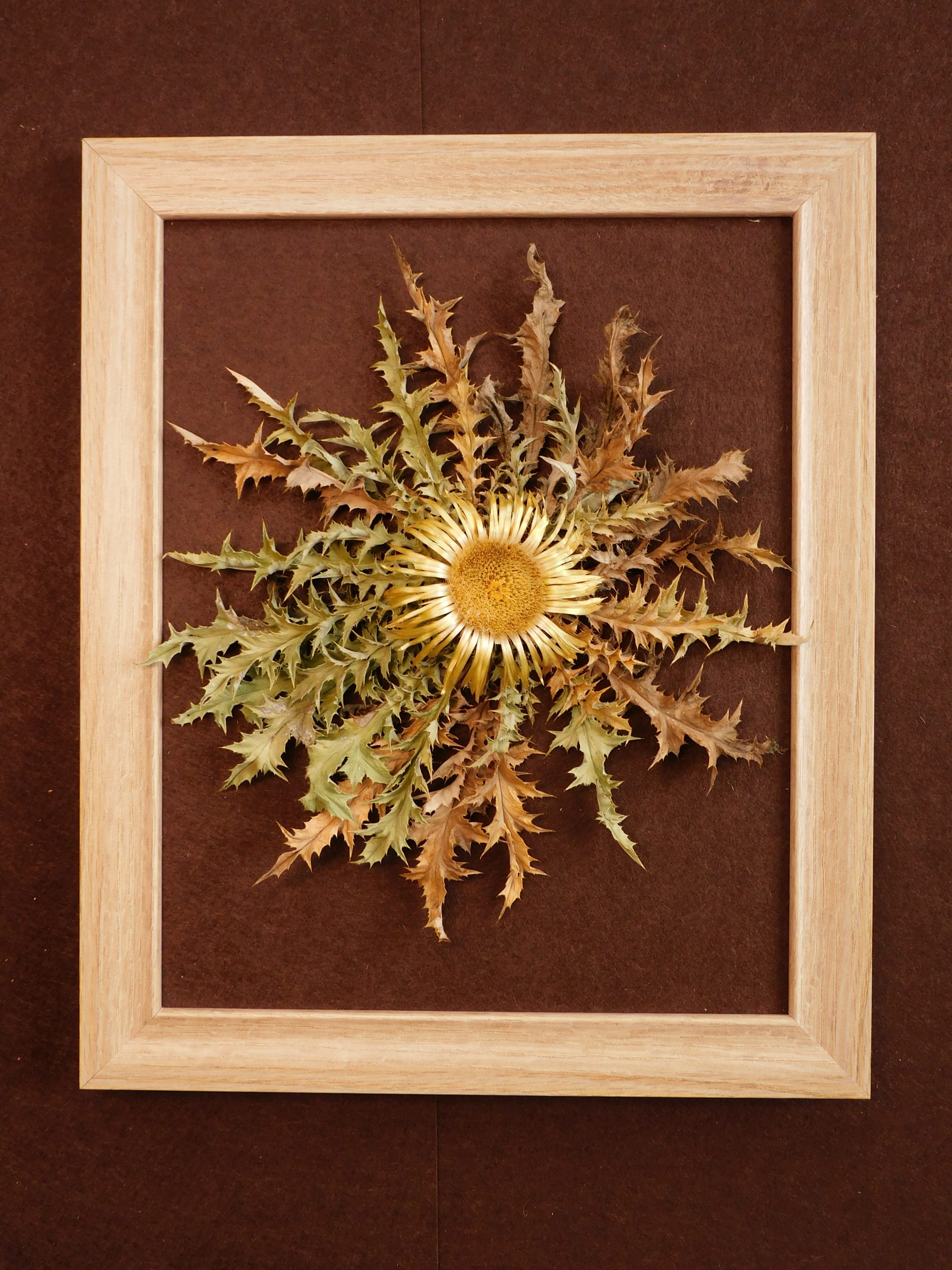 Compuesto por marco de medidas 30×24 cm, con una flor de pétalos especialmente anchos y una roseta con hojas de varios colores.