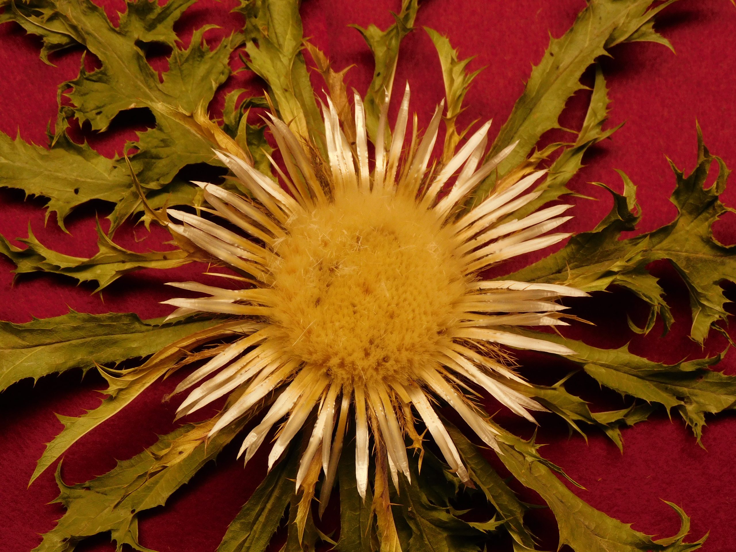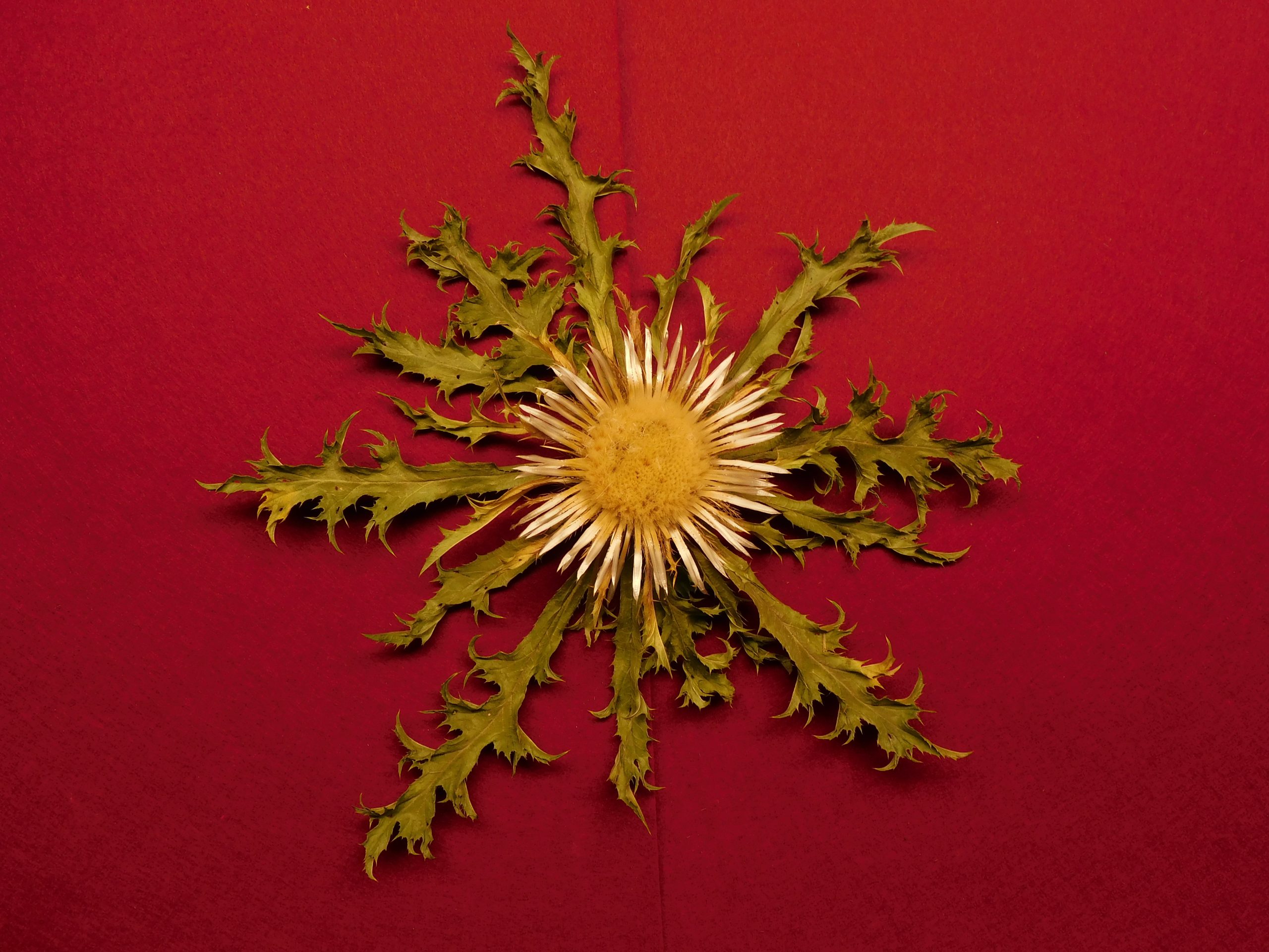 Flor de Eguzkilore blanca de 27 cm de roseta y 9 de flor central, de tamaño medio.