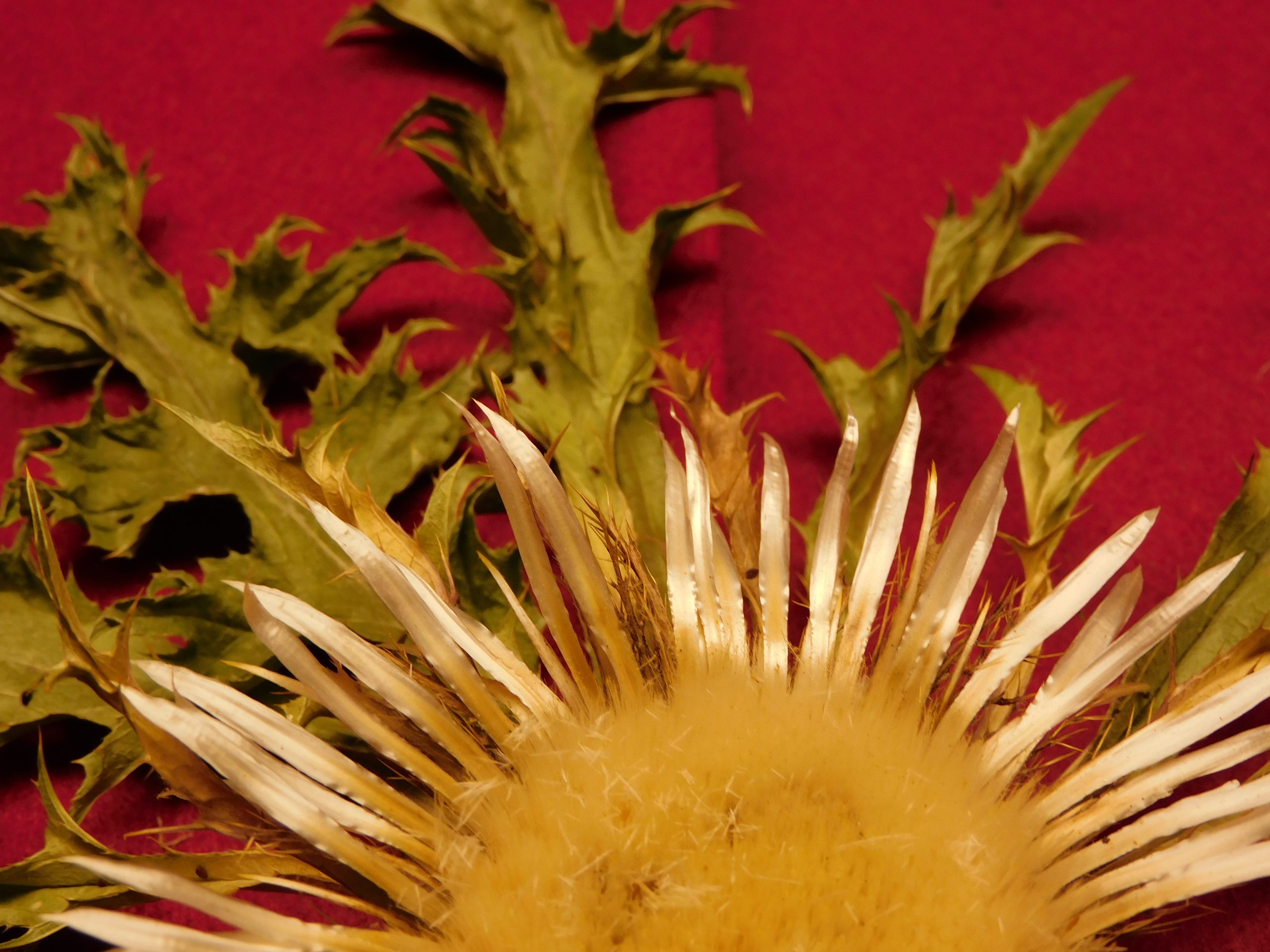 Las eguzkilores blancas o argilores no suelen tener una roseta redonda, pero la flor central de este ejemplar es especialmente redonda de forma y los pétalos son muy seguidos y numerosos. Nos encanta cómo refleja la luz, blanca, pura, intensa.