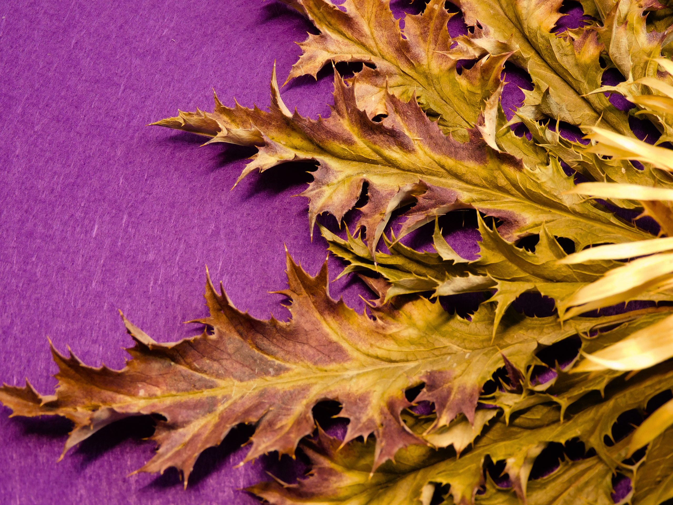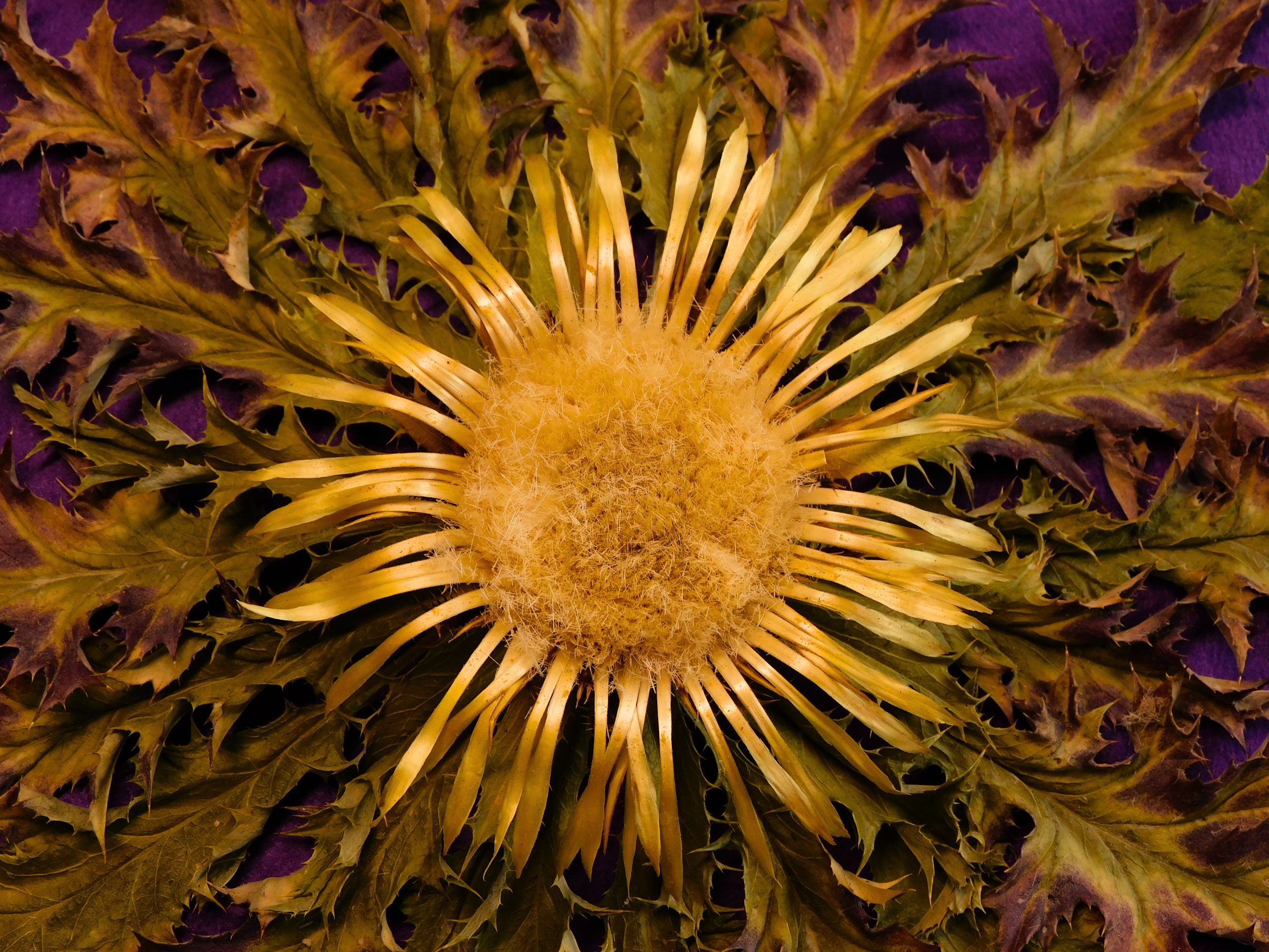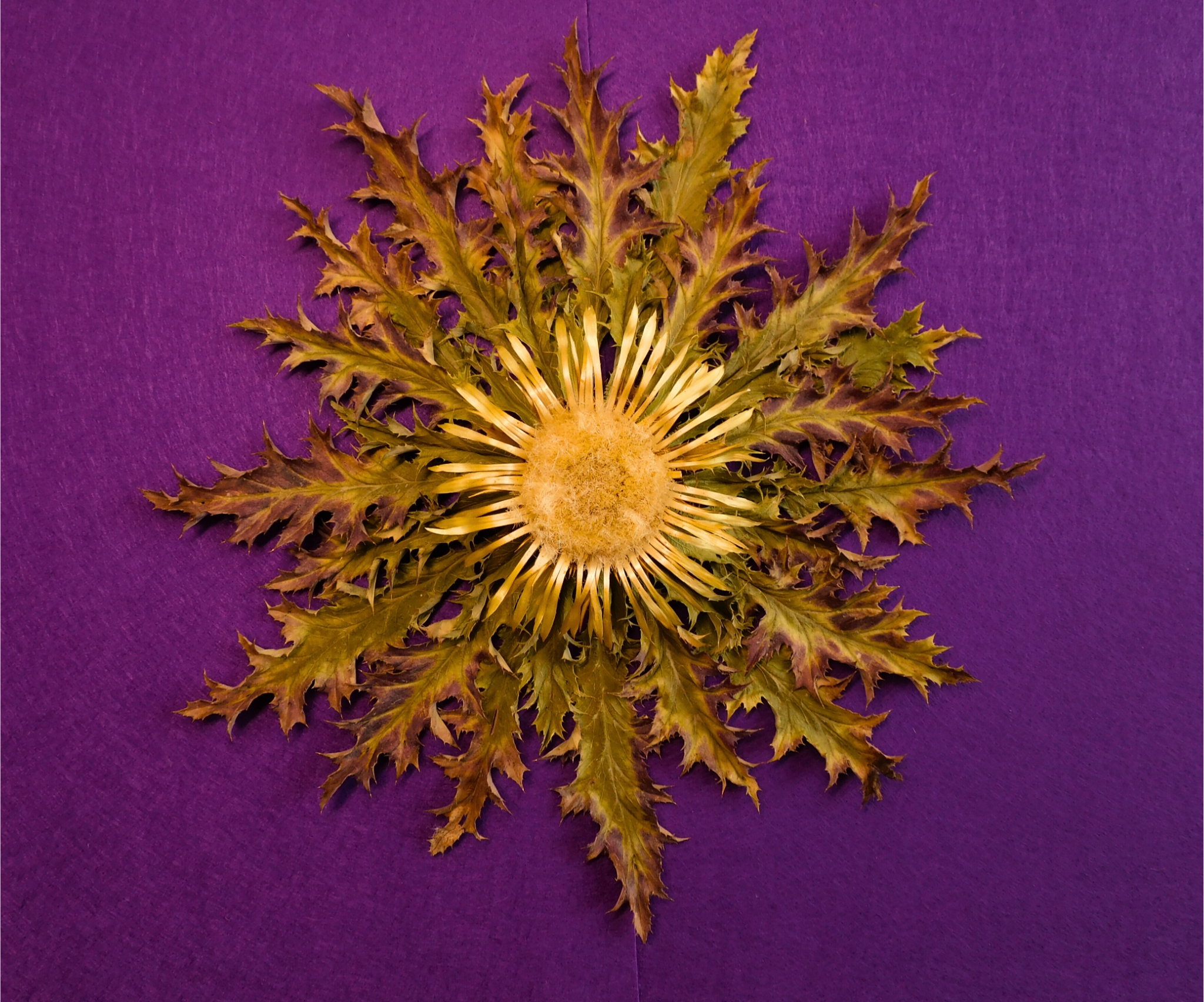 Una de las representantes de nuestas eguzkilores bicolor, muy completa en roseta y flor. Las hojas comparten los tonos típicos verdes de un correcto secado así como diferentes zonas de colores entre el rojizo, morado y burdeos debido a unas noches inusualmente frías de verano que afectaron a las flores, creando unos pocos ejemplares con esta belleza y particularidad única.