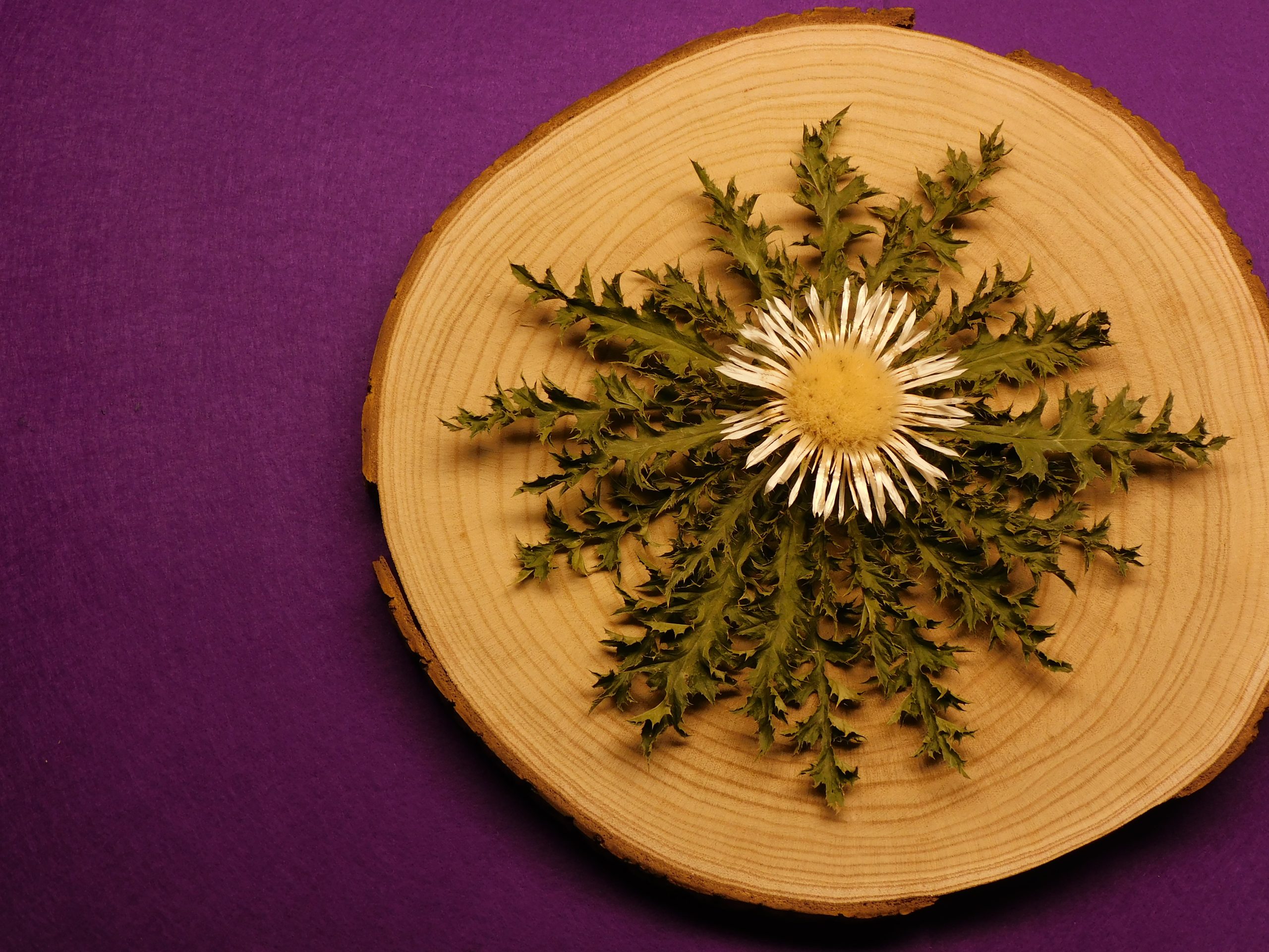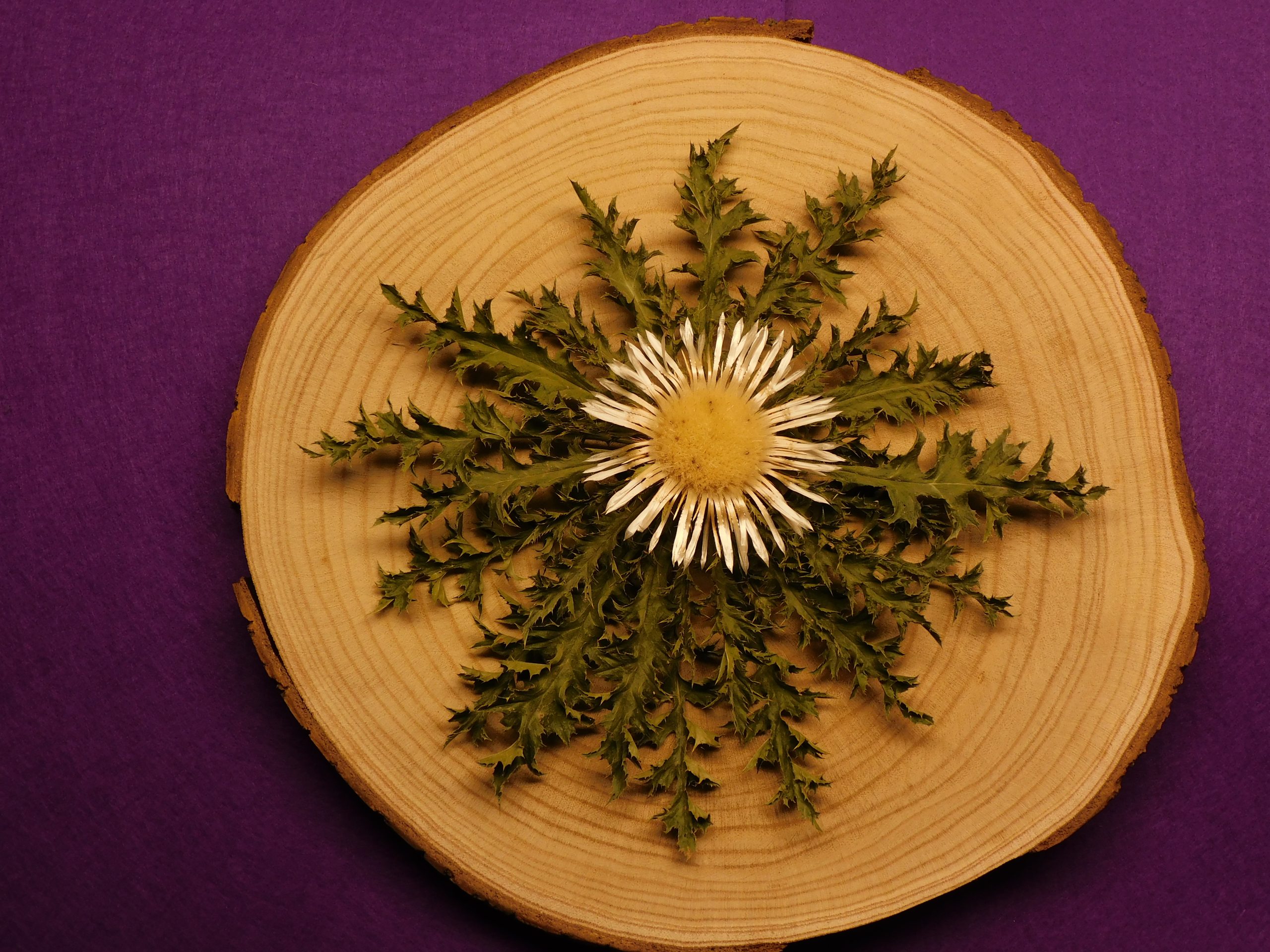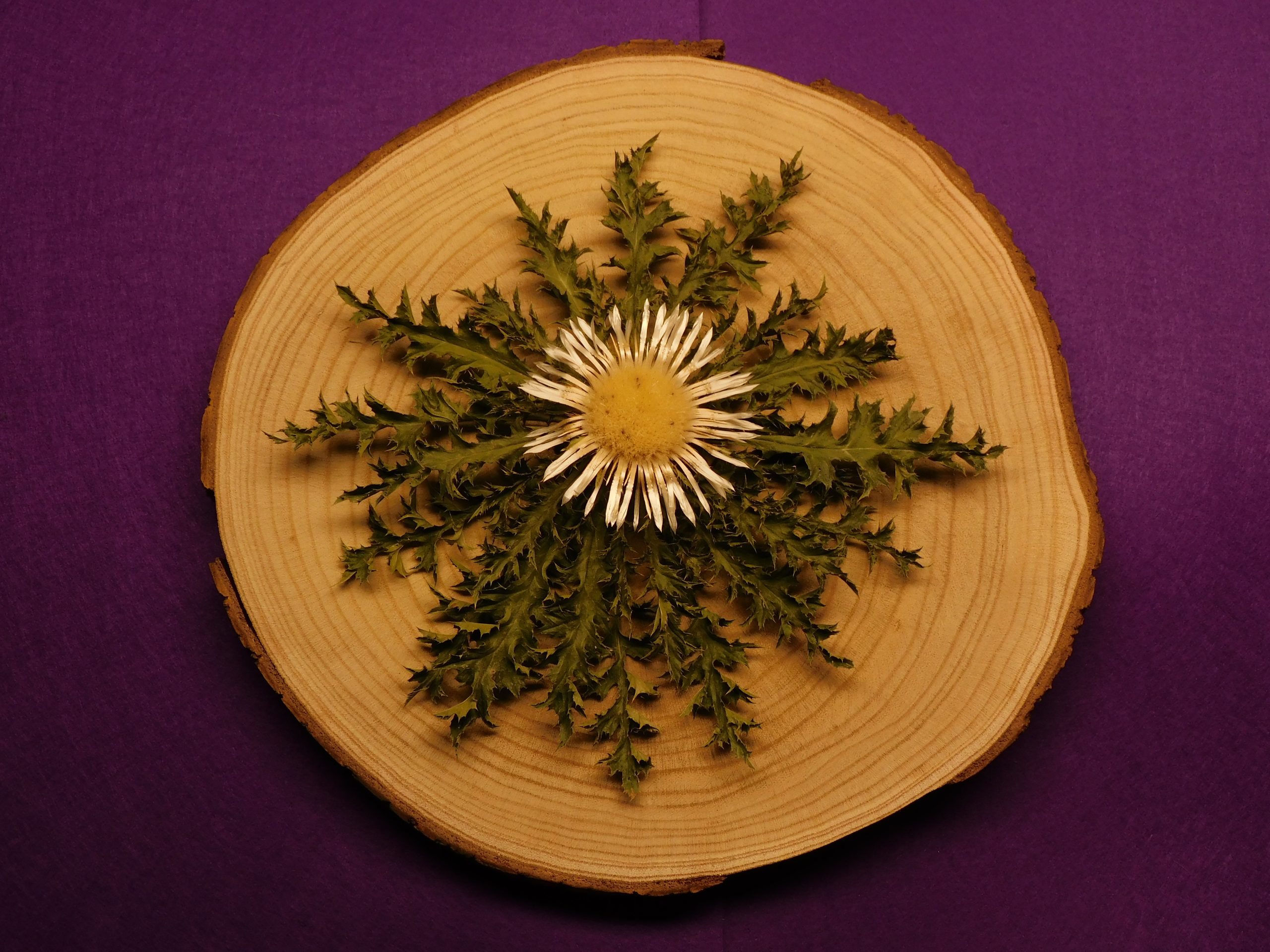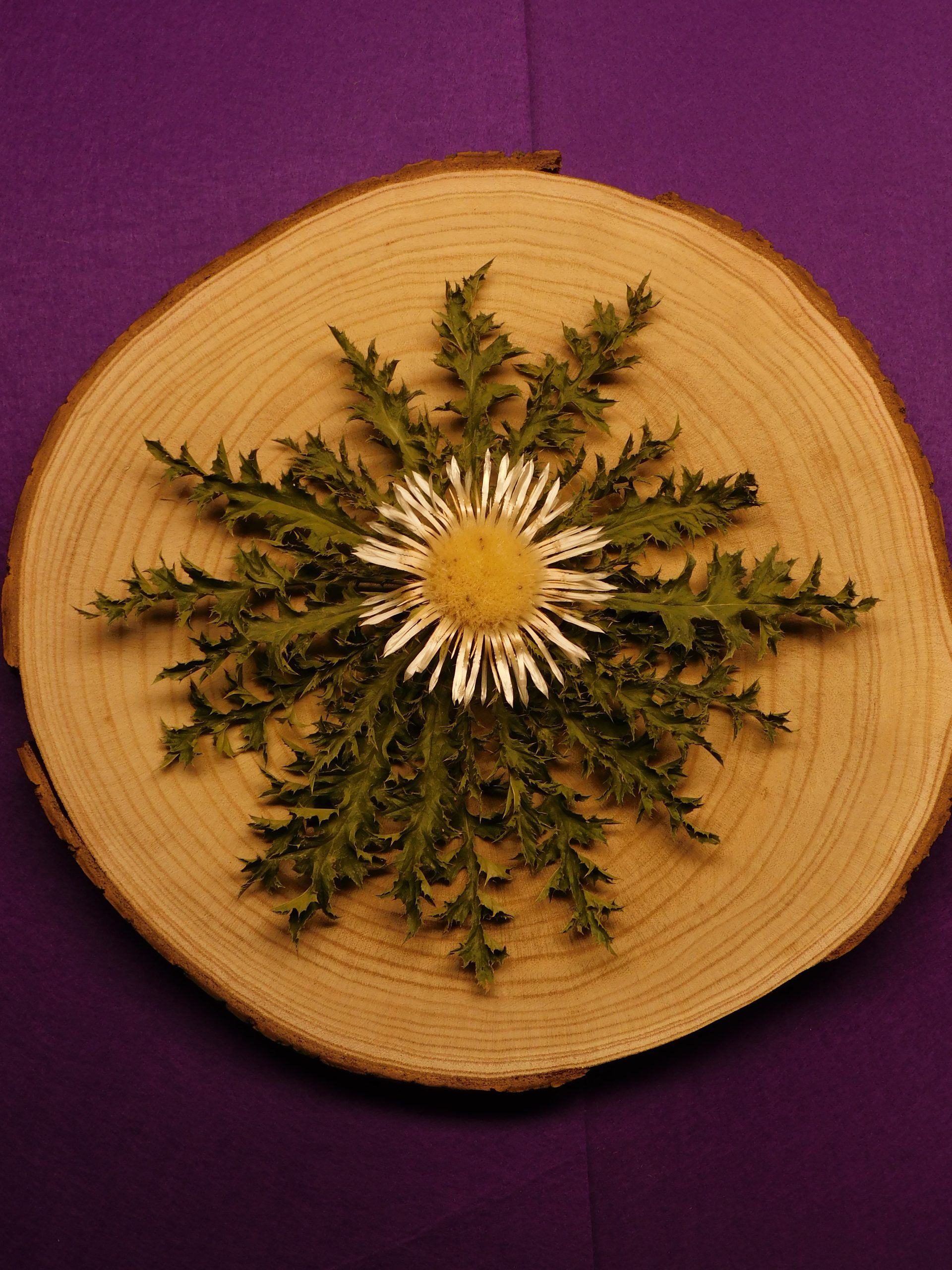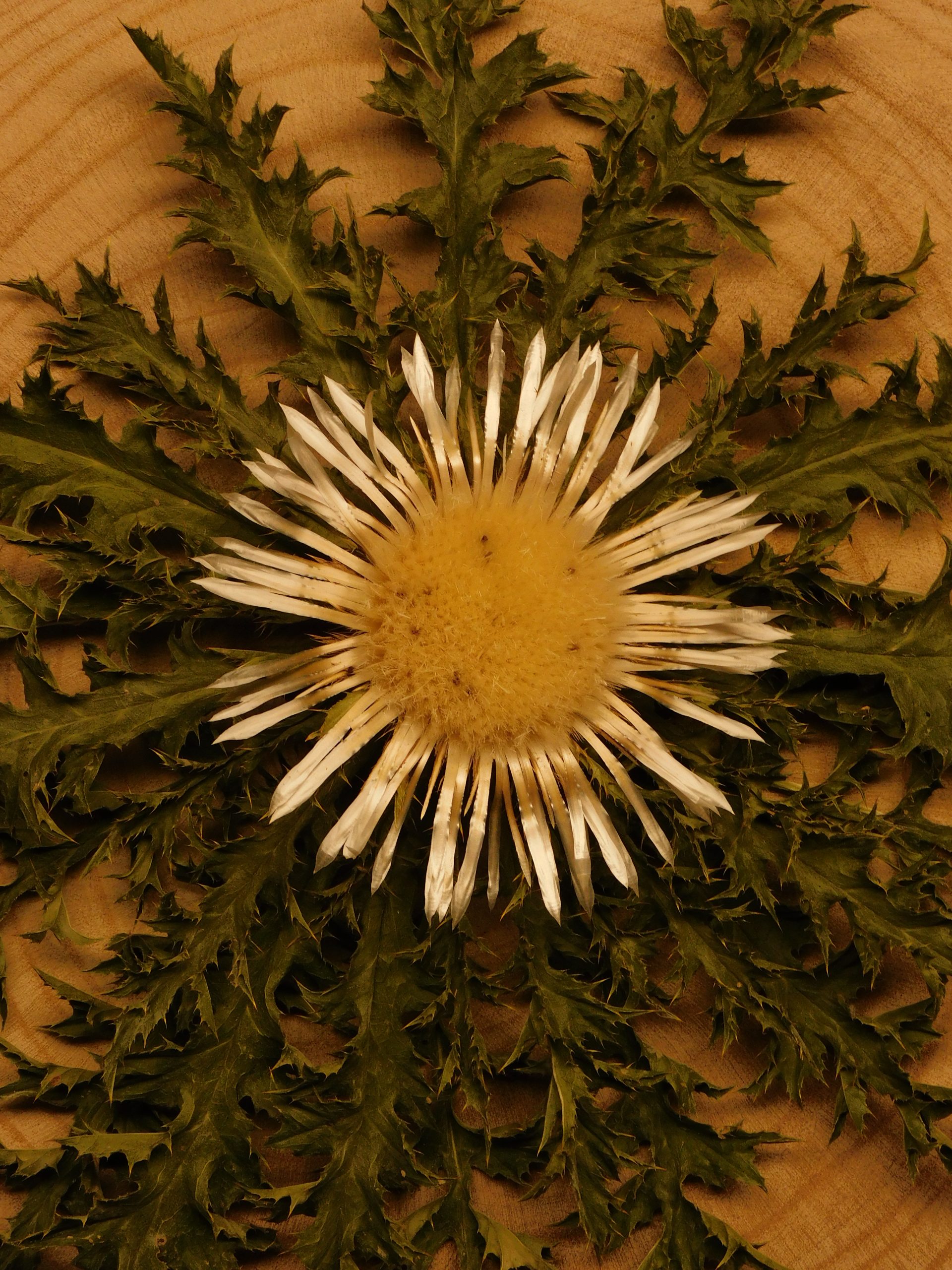 Precioso conjunto con una madera lisa y clara, que contiene una de nuestras mejores flores de eguzkilore blancas con pétalos más anchos y un nivel de acabado y detalle en el secado exquisitos.