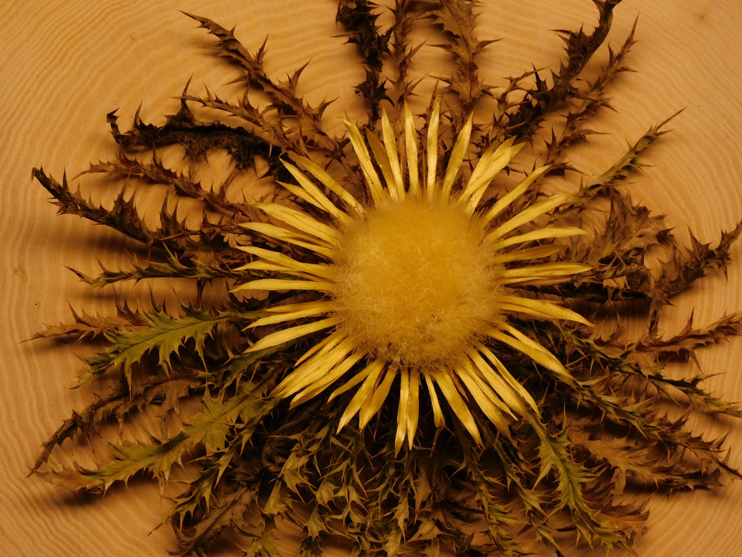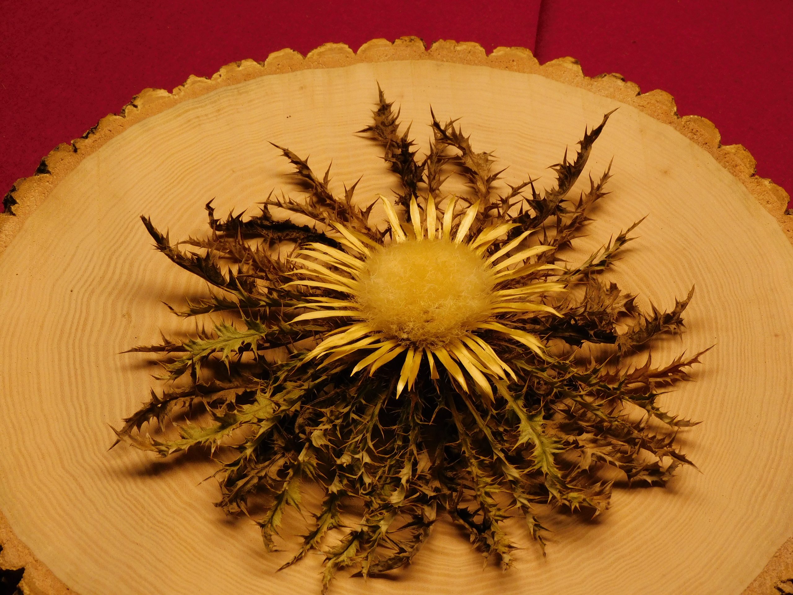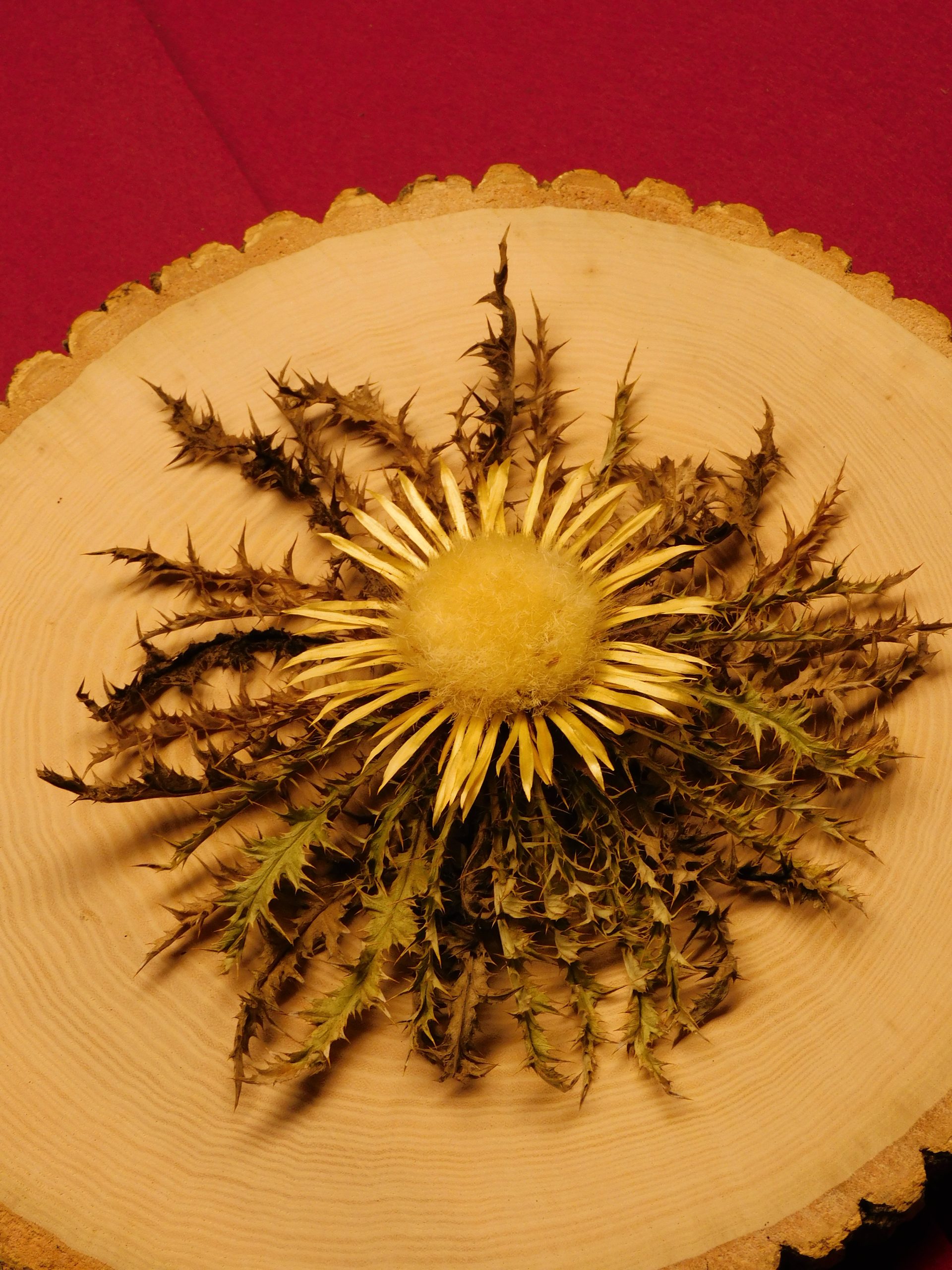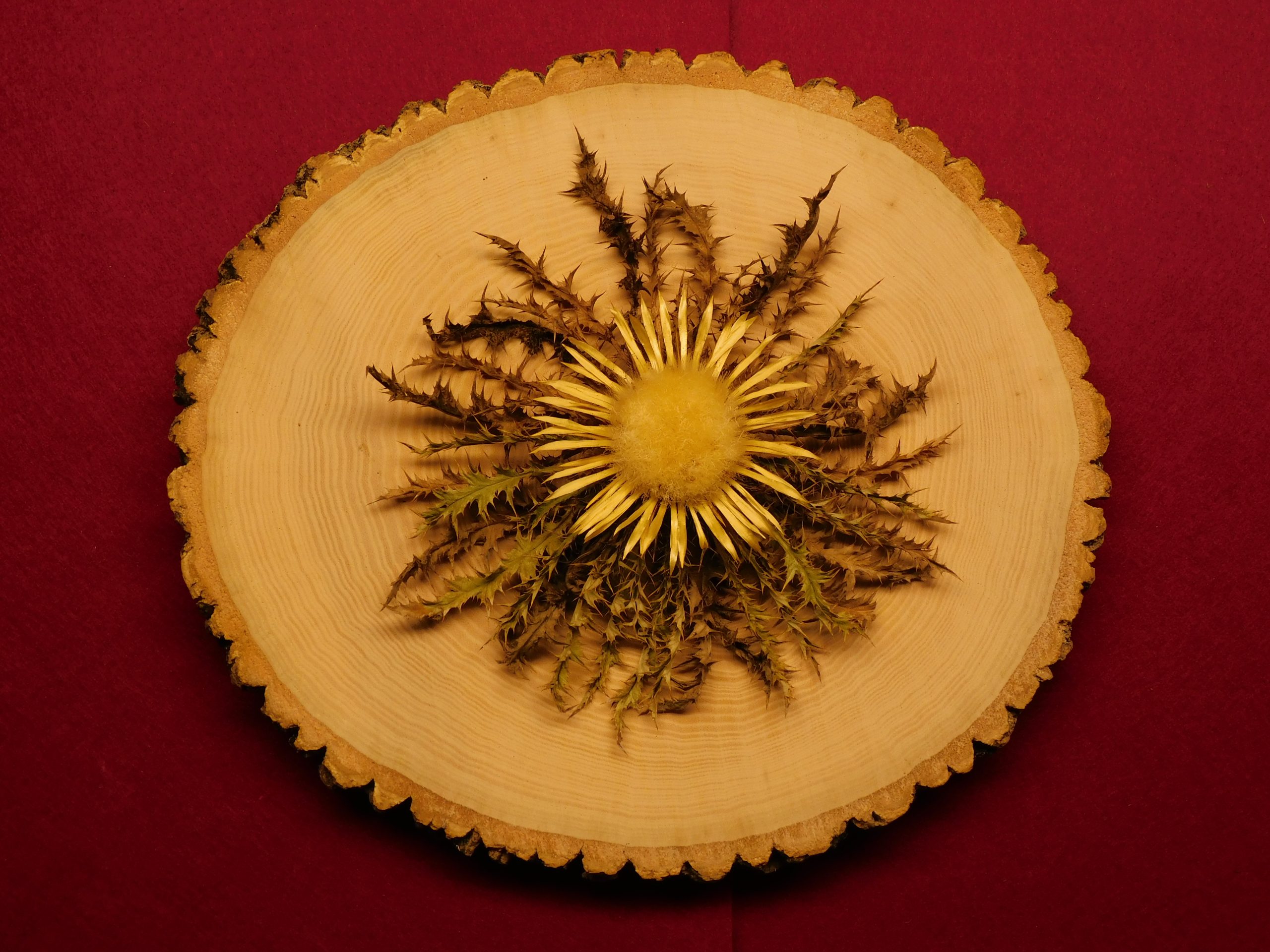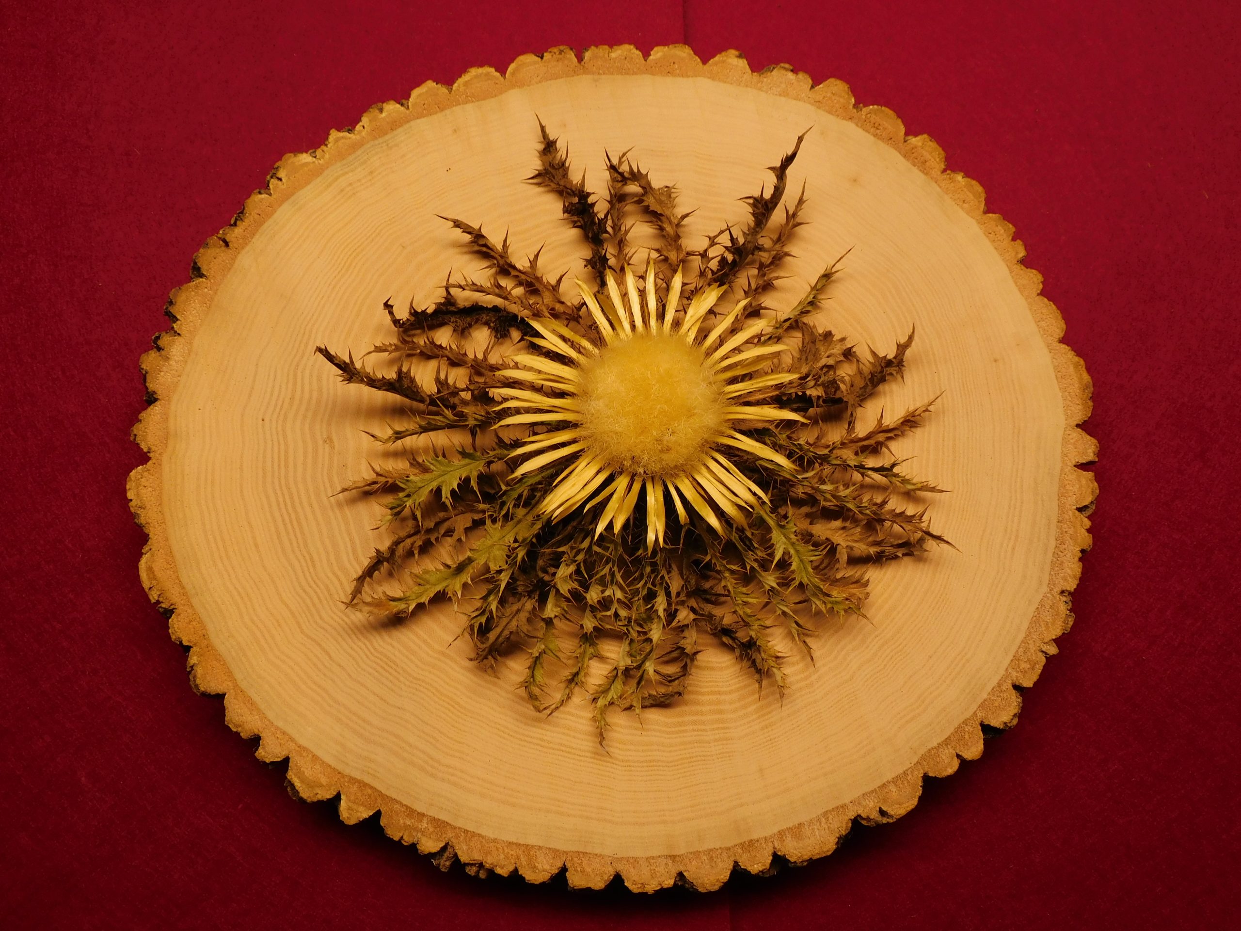Rodaja de madera de 30 cm aprox, con flor de eguzkilore de 20 cm.